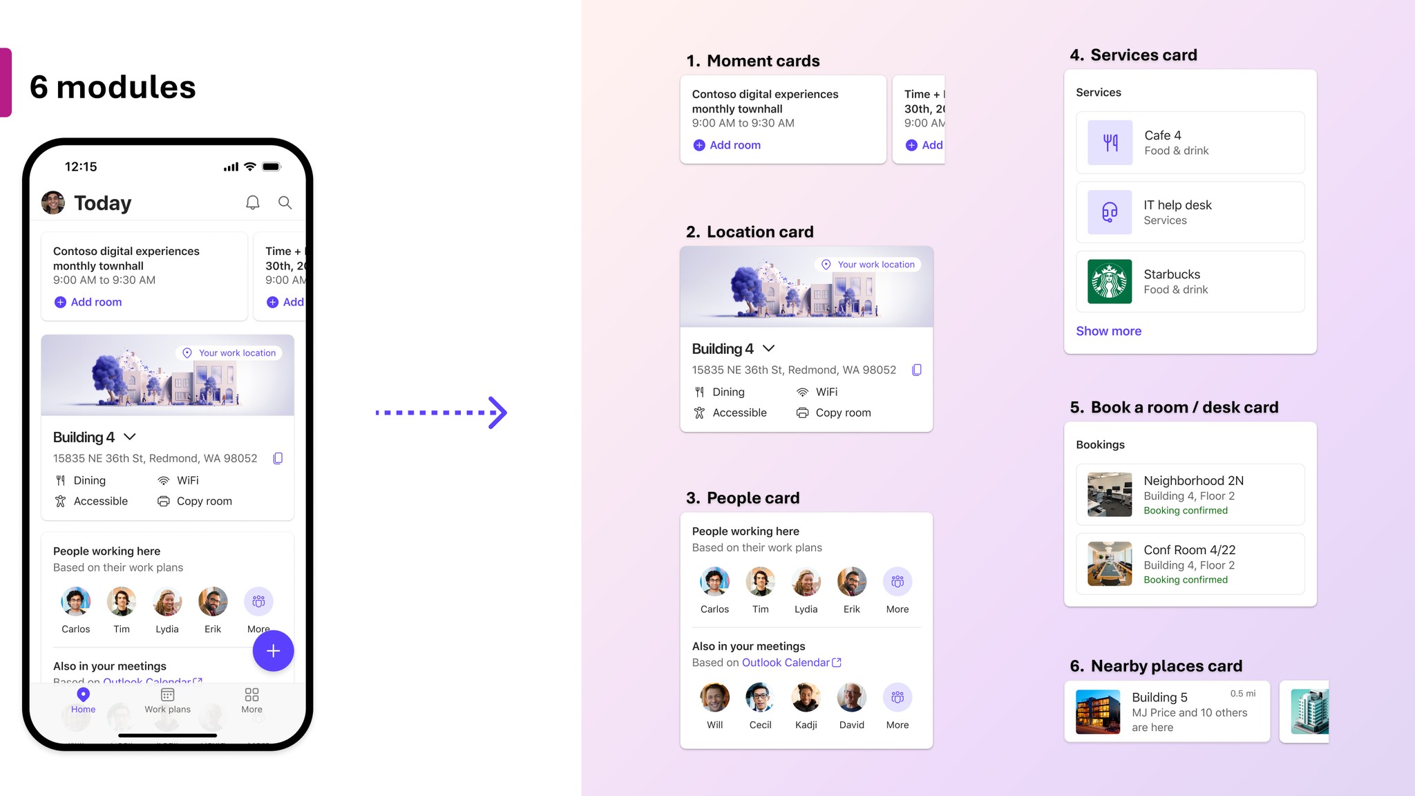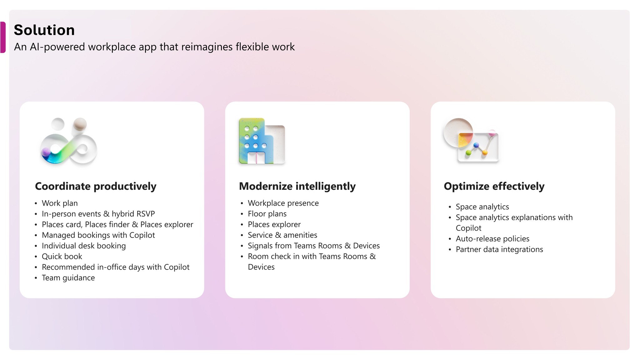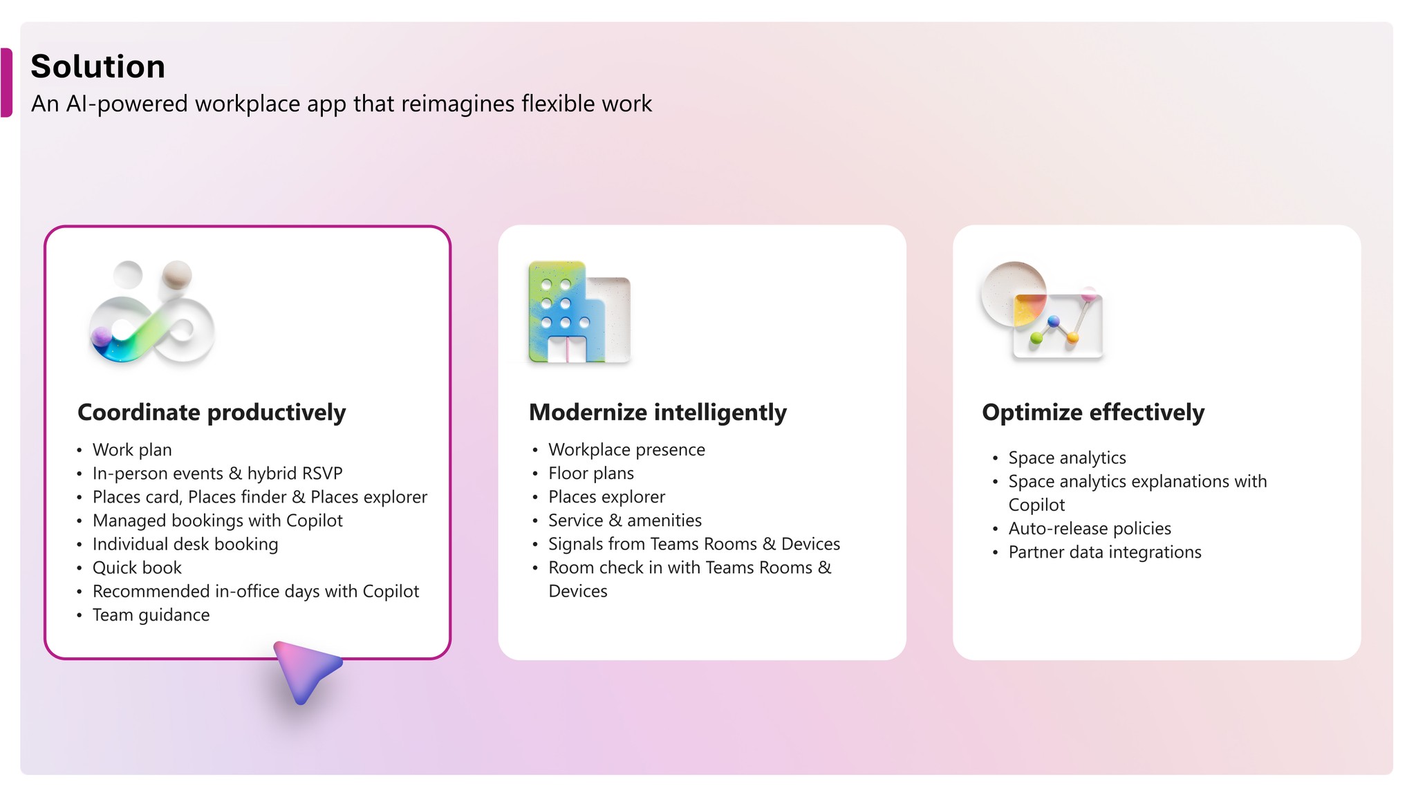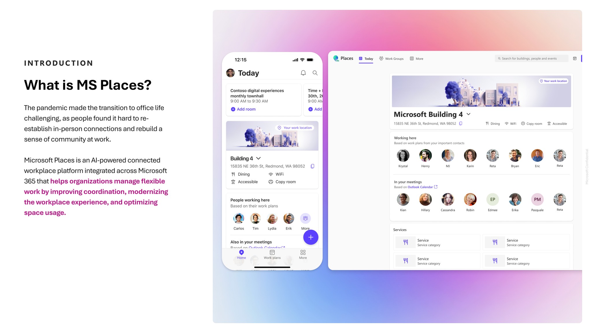 Microsoft Places reimagines flexible work by using AI to help you coordinate where work happens, modernize the workplace experience, improve employee connections, and optimize the workplace based on changing employee needs. Microsoft Places works across your everyday apps, such as Teams and Outlook, to help you stay in the flow of work.